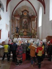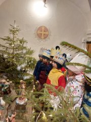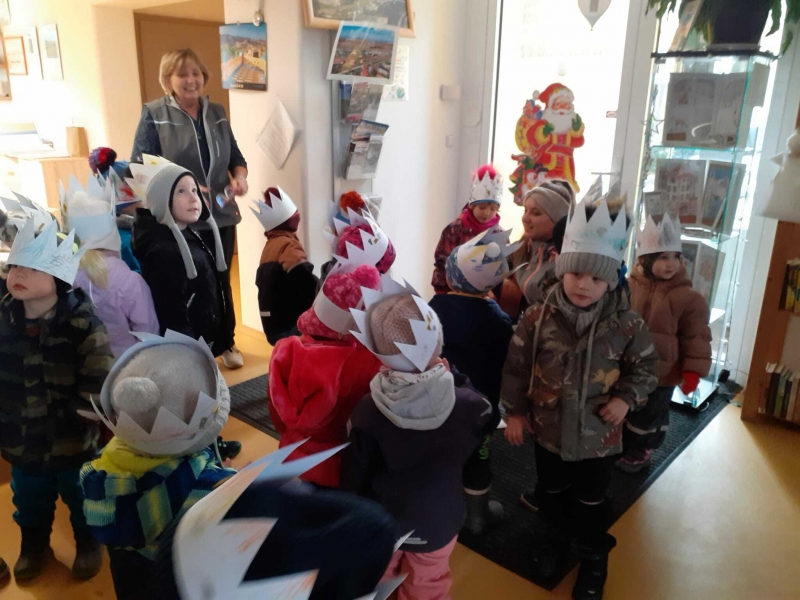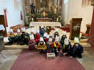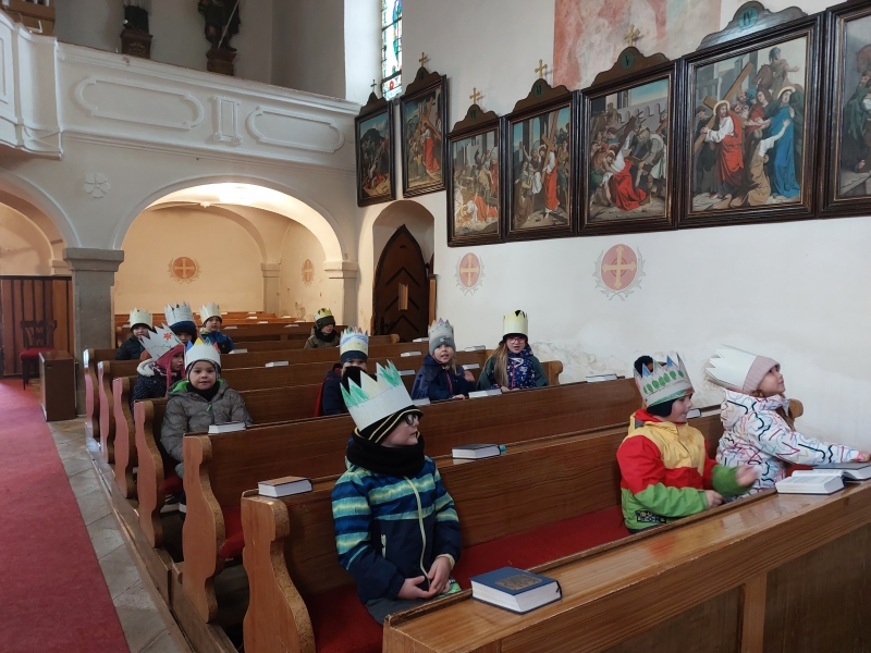 Děti si vyrobily koruny a vyrazily na OÚ, kde zazpívaly a podpořily Tříkrálovou sbírku vhozením mincí do kasičky.