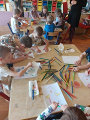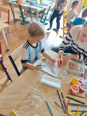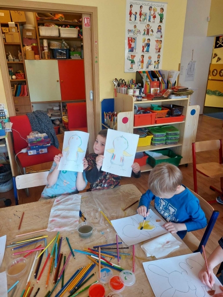 Do školky přišla paní malířka a malovala s dětmi různými metodami velikonoční motivy.