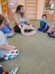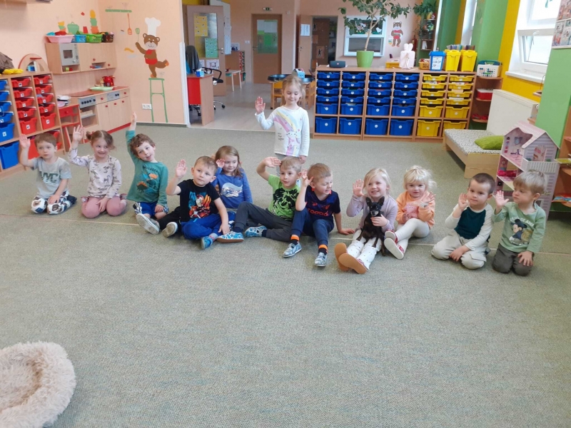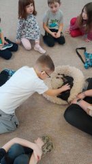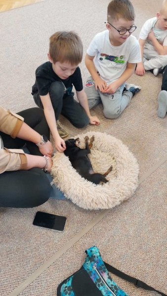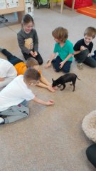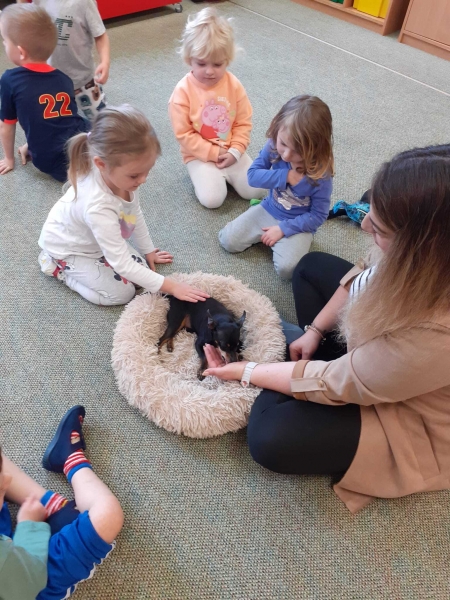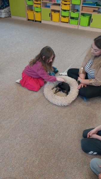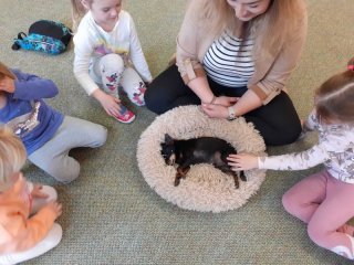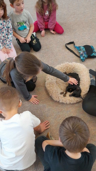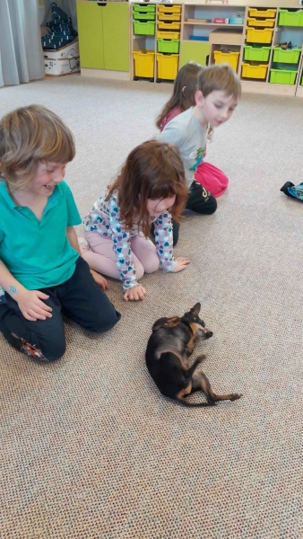 Děti se měly možnost seznámit s pejskem Tedíkem, pohladit si ho, ale dozvěděly se i bezpečné chování v přítomnosti psů.
