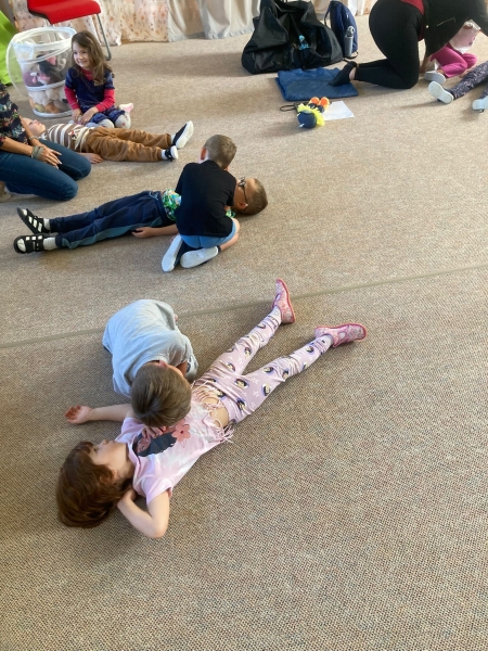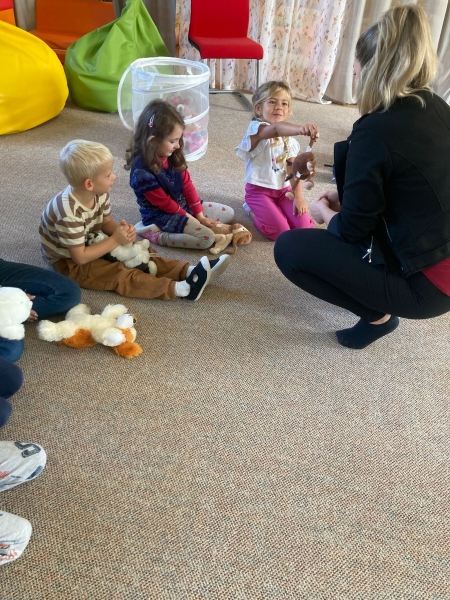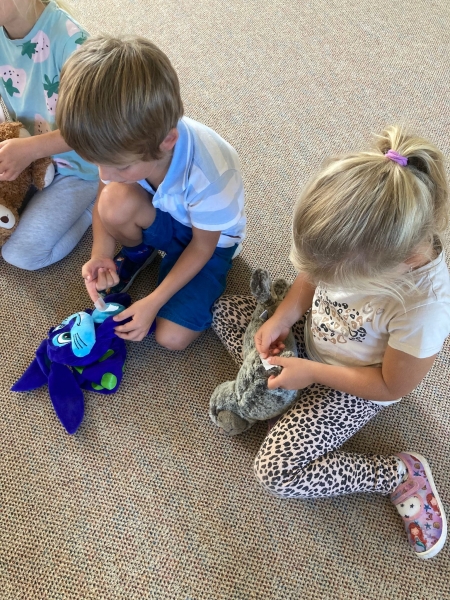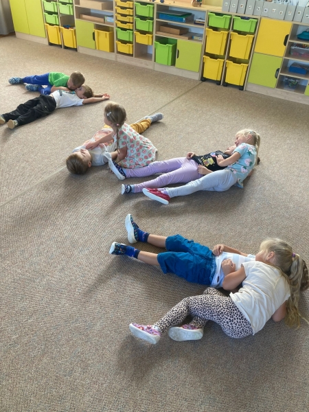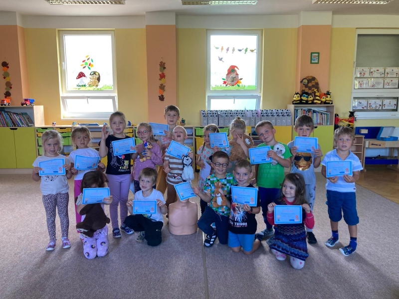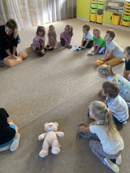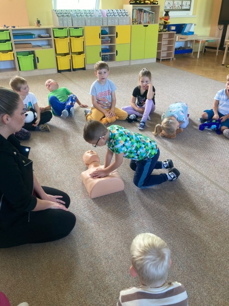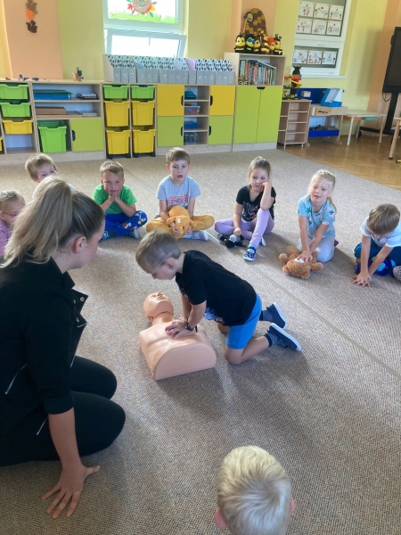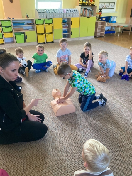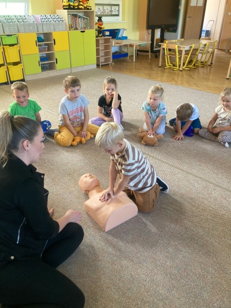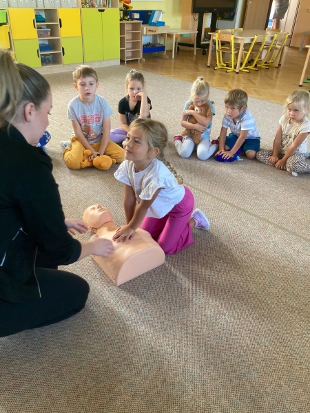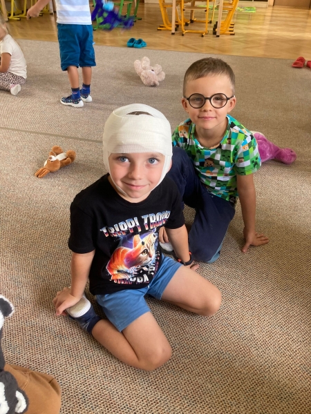 Děti si vyzkoušely jak se poslouchá srdíčko, obvázat kamarádovi zranění, masáž srdce na figuríně.