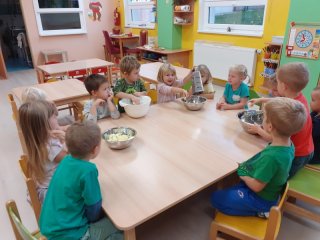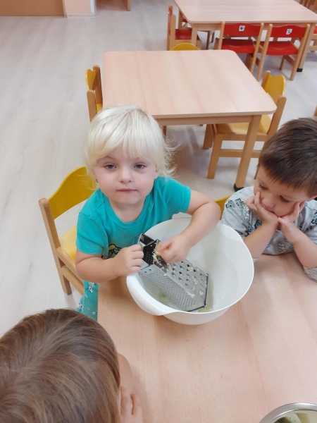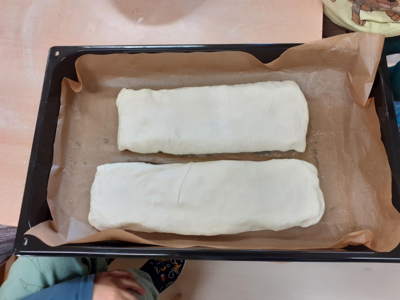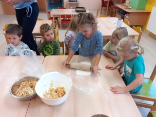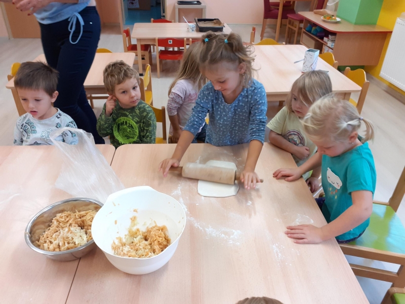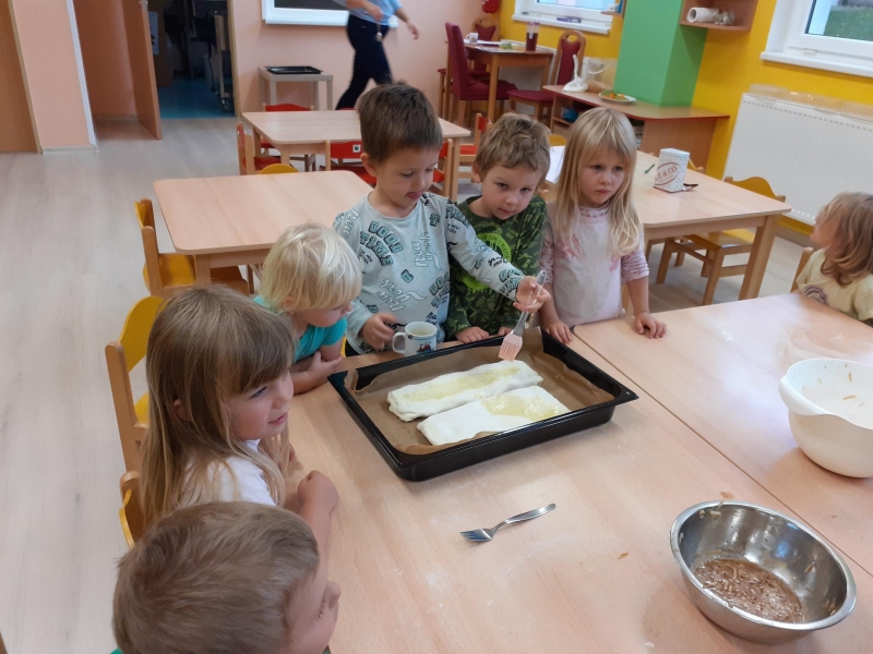 Děti ze třídy Vrabčáci si vyzkoušely , jak se peče štrůdl.