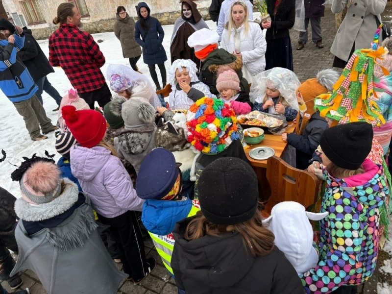 Průvod zamířil na obecní úřad, kde děti požádaly paní starostku o povolení k masopustu. Poté pokračovaly ke stavení, kde si třída Soviček připravila krátké taneční vystoupení, které potěšilo všechny přítomné.
