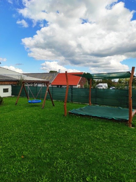 V letech 2019 až 2021 byly na naši přírodní zahradu doplněny nové herní prvky - provazová pyramida, trampolína (zapuštěná do země), nové houpačky, včetně hnízda a zastřešení pískovišť plachtami.